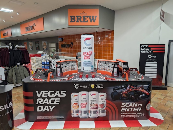 ในขณะที่ Formula 1 กำลังขยายฐานผู้ชมทั่วโลกและดึงดูดกลุ่มวัยรุ่นและผู้ใหญ่ตอนต้น CELSIUS จึงต้องการยกระดับประสบการณ์แฟล็กชิปสโตร์ด้วยการผสมผสานความตื่นตาตื่นใจ การมีส่วนร่วม และการทดลองสินค้า เพื่อนำมอเตอร์สปอร์ตเข้ามาไว้ในสภาพแวดล้อมรีเทลได้อย่างลงตัว มีการติดตั้งหน้าร้าน Morrisons Westcroft ใน Milton Keynes ซึ่งลาน Scalextric แบบอินเทอร์แอคทีฟจะท้าทายนักช้อปให้ทำเวลารอบเร็วที่สุดเพื่อชิงพื้นที่ขึ้นกระดานคะแนน ผู้เข้าร่วมจะได้รับของที่ระลึกชุดแข่งรถ CELSIUS สุดพิเศษเป็นรางวัล