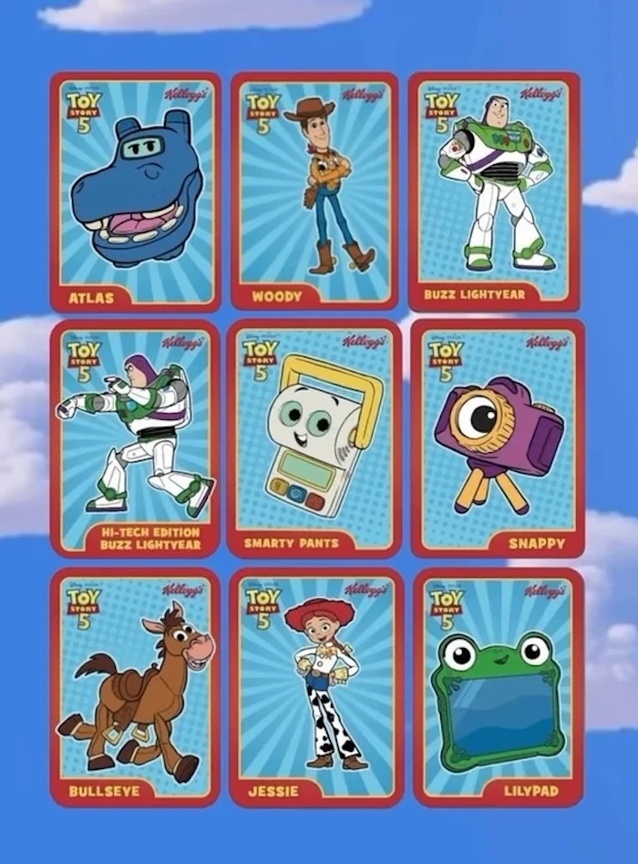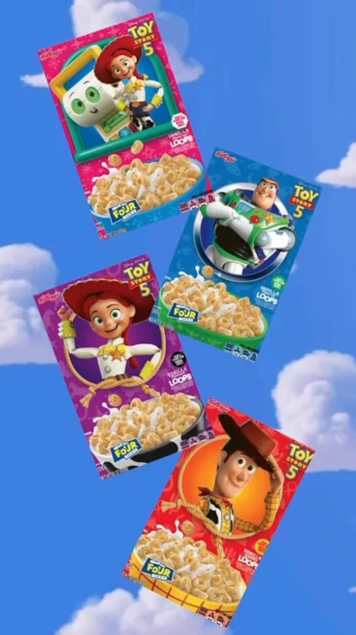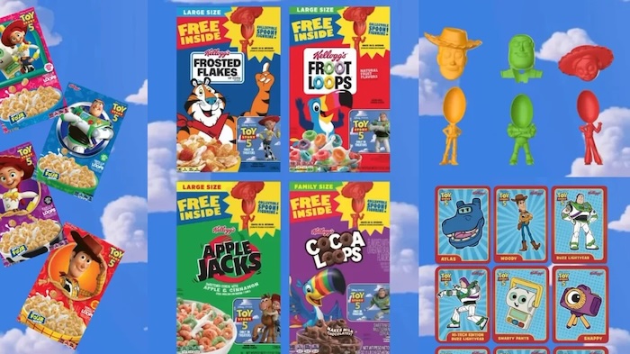 ซีเรียลหลากหลายของ Kellogg’s ไม่ว่าจะเป็น Froot Loops, Frosted Flakes, Apple Jacks, Rice Krispies และ Corn Pops ต่างได้รับการออกแบบบรรจุภัณฑ์พิเศษที่ระบุข้อความ “Free Inside” อันเป็นสัญลักษณ์คลาสสิกที่เคยครองชั้นวางสินค้าในยุคก่อนหน้านี้ ภายในกล่องบรรจุของสะสมจิ๋วจากตัวละครดัง อาทิ Woody, Buzz Lightyear และ Jessie รวมถึงช้อนธีม Toy Story และการ์ดสะสม บางกล่องยังมีโปรโมชันพิเศษที่เชื่อมโยงกับการฉายภาพยนตร์ในโรงอีกด้วย