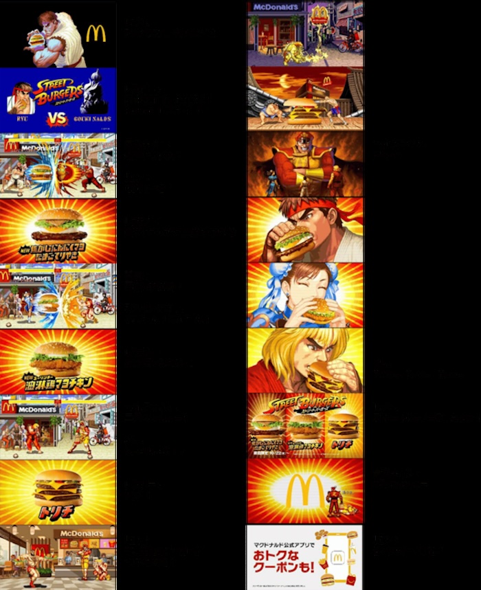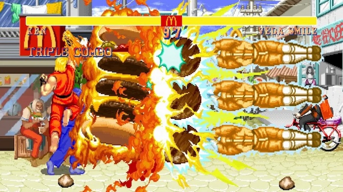 McDonald’s ประเทศญี่ปุ่นเดินหน้าโปรโมต “Street Burgers” เมนูใหม่ที่ได้แรงบันดาลใจจากเกม Street Fighter โดยร่วมมือครั้งแรกกับผู้ผลิตเกมอย่าง Capcom กลายเป็นเมนูเบอร์เกอร์เอ็กซ์คลูซีฟที่ขายจำนวนจำกัด เรียกความตื่นเต้นจากแฟนเกมเพราะนำพลังเกมอาร์เคต 8 บิตมาผสมผสานกับเมนูฟาสต์ฟู้ดจานด่วน และมีตัวละครหลักนักสู้มาเพิ่มมนต์ขลังให้แคมเปญดูร้อนแรงสุด ๆ