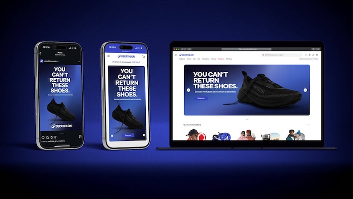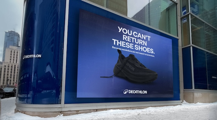 Decathlon แบรนด์กีฬาและไลฟ์สไตล์ชื่อดัง เปิดตัวนโยบายพิเศษ “คืนสินค้าไม่ได้” สำหรับรองเท้าวิ่งรุ่นขายดี เรียกความสนใจจากตลาดแคนาดาด้วยสื่อกลางแจ้งโดดเด่นเป็นสง่า ประกาศการยกเลิกสิทธิ์การคืนสินค้าสำหรับรองเท้าวิ่งรุ่นนี้โดยเฉพาะ เพื่อให้ลูกค้าที่ซื้อไปแล้วไม่มีทางเลี่ยง ต้องลุยออกกำลังกายจริงๆ