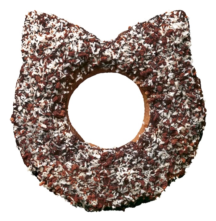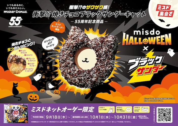 MisterDonut เรียกเมนูพิเศษนี้ว่า “แมวดำช็อคโกแล็ต” นอกจากรูปร่างแมวน้อยสุดน่ารักที่จะมอบกลิ่นอายฮาโลวีน จัดเต็ม 5 ชั้นความอร่อยเพื่อเฉลิมฉลองครบรอบ 55 ปี MisterDonut ด้วยเนื้อสัมผัสกรุบกรอบจากการคอลแลบกับ Black Thunder ช็อกโกแลตแบรนด์ดังจากญี่ปุ่น ทำให้โดนัทรูปแมวมีช็อกโกแลตฟิลลิ่ง, โกลเด้นท็อปปิ้ง, บิสกิตและคุกกี้โกโก้กรุบกรอบ, เคลือบช็อกโกแลตแล้วอบให้หอม ปิดท้ายด้วยการโรยหน้าด้วยช็อกโกแลตกรันช์และมะพร้าว