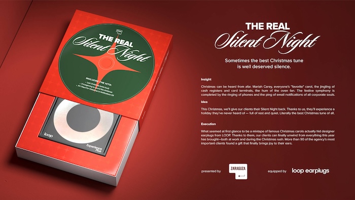 Zaraguza เป็นเอเจนซี่โฆษณาจากสาธารณรัฐเช็ก ที่ส่งของขวัญปีใหม่สุดครีเอทีฟให้กับลูกค้ากว่า 90 รายในเดือนธันวาคม 2025 โดยออกแบบบรรจุภัณฑ์หลอกตาในสไตล์ Mixtape ที่ดูเหมือนเทปรวมเพลงคริสต์มาสคลาสสิก แต่เมื่อแกะออกมา จะมีตัวอุดช่องหู “Loop Earplugs” พร้อมข้อความว่า “บางครั้งเพลงคริสต์มาสที่ดีที่สุดคือความเงียบที่คุณสมควรได้รับ”