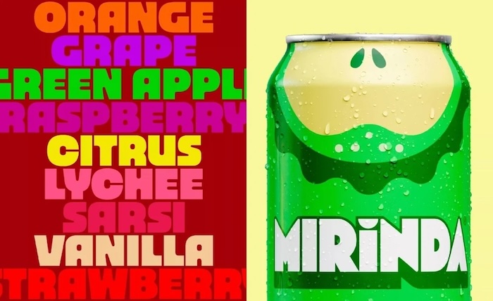 ในด้านการออกแบบ ภาพลักษณ์ใหม่ของ Mirinda มีชีวิตชีวาและแสดงออกมากยิ่งขึ้น โลโก้ถูกปรับให้ดูคมชัด ด้วยตัวอักษรที่ทรงพลัง จับคู่กับจานสีสดใสคอนทราสต์สูง เพื่อให้แต่ละรสชาติโดดเด่นและจดจำได้ง่าย ขณะเดียวกันกราฟิกที่ได้แรงบันดาลใจจากผลไม้ รูปทรงโค้งมน และลวดลายคล้ายฟองอากาศ ช่วยสื่อถึงความสนุกสนานและความสดชื่น โดยมีองค์ประกอบรูปครึ่งวงกลมที่แอบซ่อนภาพของรอยยิ้มไว้อย่างแนบเนียน เชื่อมโยงรสชาติเครื่องดื่มเข้ากับภาษาภาพที่เป็นหนึ่งเดียว