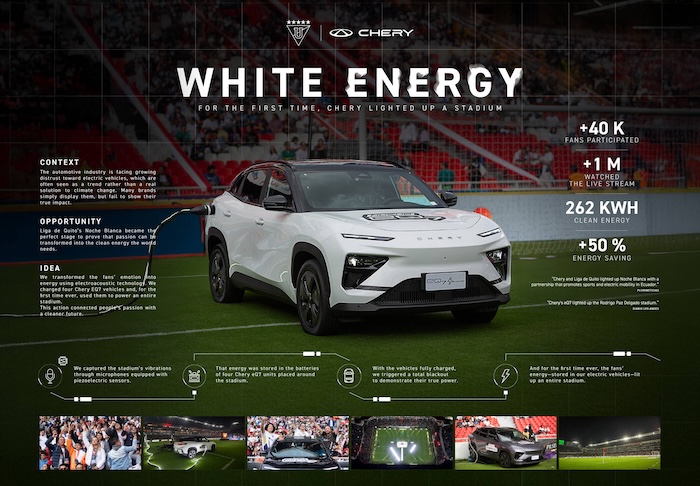 Chery White Energy แคมเปญพลังงานสีขาว ที่เกิดจากพลังเชียร์นี้เปิดตัวในประเทศเอกวาดอร์เมื่อเดือนมกราคม 2025 สร้างสรรค์โดยเอเจนซี่ Norlop VML Ecuador ให้กับแบรนด์ Chery แคมเปญนี้ผสมผสาน Ambient Media, Digital และ Experiential Marketing เข้าด้วยกัน สำหรับธุรกิจยานยนต์และการขนส่งส่วนบุคคล ซึ่งสามารถทำให้เห็นว่าความหลงใหลของแฟนบอลไม่ใช่แค่เสียงเชียร์ แต่สามารถเป็นพลังงานที่จับต้องได้จริง ด้วยนวัตกรรมจาก Chery