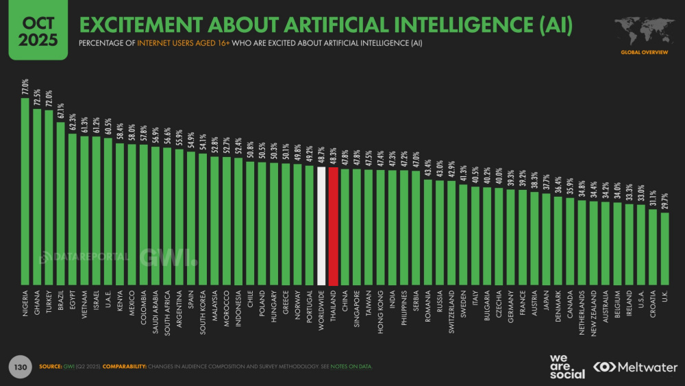 โดยข้อมูลระบุว่า 48.3% ของผู้ใช้อินเทอร์เน็ตในไทยรู้สึก “ตื่นเต้น” กับการใช้ AI หมายถึงผู้คนเกือบครึ่งของประเทศไทยสนใจด้าน AI ยิ่งเมื่อเทียบกับความสนใจด้าน AI ทั่วโลกก็พบว่า ความสนใจด้าน AI ของคนไทยใกล้เคียงกับค่าเฉลี่ยทั่วโลกที่มีมีความสนใจถึง 48.7% สะท้อนว่าคนไทยมีเปิดรับเทคโนโลยีใหม่ๆ อย่าง AI อย่างเปิดกว้างและเต็มที่ ขณะที่ไนจีเรียและกาน่าเป็น 2 ประเทศที่สนใจ AI มากที่สุดในโลกถึง 77% และ 72.5% ตามลำดับ