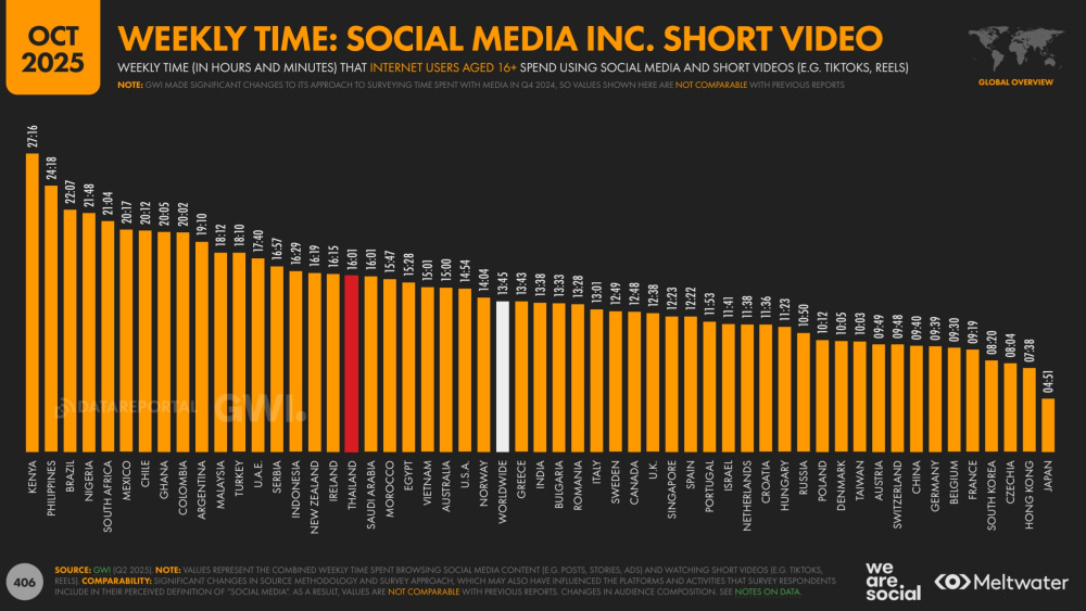 สำหรับคนไทยแล้ว Social Media ยังคงเป้นช่องทางหลักในการใช้สื่อสาร โดย “ชาวโซเชียลไทย” ยังคงใช้งาน Social Media เฉลี่ย 7.3 แพลตฟอร์มต่อเดือน และใช้เวลาบนโซเชียลฯ นานราว 16 ชั่วโมงต่อสัปดาห์ มากกว่าค่าเฉลี่ยทั่วโลกที่ 13.45 ชั่วโมงต่อสัปดาห์