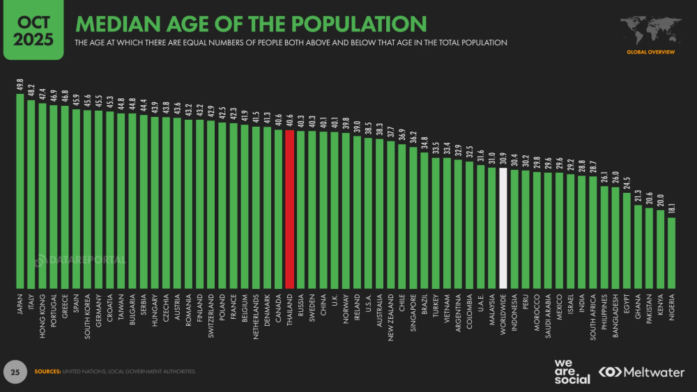 ยิ่งเมื่อลงรายละเอียดไปจะพบว่า ประชากรทั่วโลกมีสูงถึง 8.25 พันล้านคน โดยมีผู้ชายมากกว่าผู้หญิงเล็กน้อย สำหรับประเทศไทยมีจำนวนประชากรประมาณ 71.6 ล้านคน อยู่ในอันดับที่ 20 ของโลก ลดลง -0.07% ต่อปี ชี้ให้เห็นถึงอัตราการเกิดที่ลดลง โดยโครงสร้างประชากรไทยเปลี่ยนแปลงไปที่กลุ่ม Silver Age ซึ่งพบว่า อายุเฉลี่ยของคนไทยอยู่ที่ 40.6 ปี สูงกว่าค่าอายุเฉลี่ยโลกที่ 30.9 ปี แถมส่วนใหญ่คนไทยเป็นผู้หญิงมากกว่าผู้ชายพอสมควร โดยคนไทยมีอายุเฉลี่ยอยู่ที่ 76.8 ปี