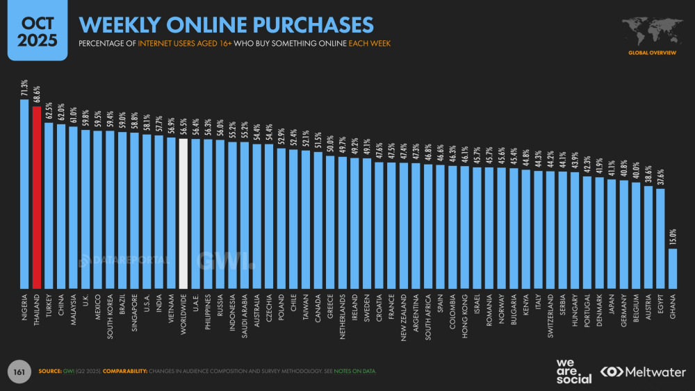 นั่นไม่ใช่เรื่องเกินจริง เพราะข้อมูลระบุว่า คนไทยกว่า 43.3% ซื้อของสดออนไลน์ทุกสัปดาห์ทิ้งห่างค่าเฉลี่ยโลกที่ซื้ออยู่เพียง 28.4% เท่านั้น ชี้ให้เห็นว่าพฤติกรรมการช้อปออนไลน์กลายเป็นพฤติกรรมถาวรไปแล้ว จนทำให้การสั่งหมูเห็ดเป็ดไก่สามารถสั่งผ่านแอปฯ ได้จนกลายเป็นเรื่องปกติ เมื่อดูภาพรวมการช้อปออนไลน์ต่อสัปดาห์ คนไทยก็ยังจัดว่าช้อปออนไลน์สูง โดยอยู่อันดับ 2 ของโลกถึง 68.6% เป็นรองแค่ไนจีเรียที่ช้อปถึง 71.3% ในการซื้อสินค้าและบริการออนไลน์รายสัปดาห์