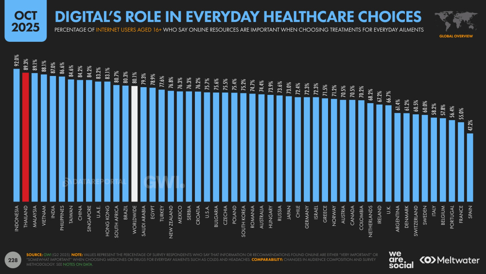 จากข้อมูลระบุว่า 89.3% ของคนไทย ให้ความสำคัญอย่างยิ่งกับข้อมูลดิจิทัลในการดูสุขภาพทุกวัน และประเทศไทยยังติดอันดับ 2 ของโลก รองจากอินโดนีเซียที่ให้ความสำคัญกับข้อมูลดิจิทัลในการดูสุขภาพทุกวันถึง 92% ขณะที่ค่าเฉลี่ยทั่วโลกในการใช้ข้อมูลดิจิทัลเพื่อดูสุขภาพทุกวันอยู่ที่เพียง 80.1% แม้ว่าคนไทยจะเชื่อข้อมูลดิจิทัลเหล่านั้น แต่เมื่อดูการใช้งานแอปฯ ด้านสุขภาพหรือฟิตเนสกลับอยู่ที่เพียง 25.2% ต่อเดือน
