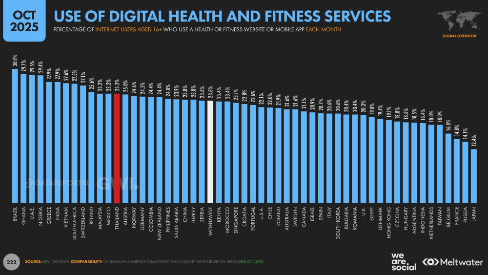 อย่างไรก็ตามการใช้งานแอปฯ ด้านสุขภาพหรือฟิตเนสของประเทศไทยก็ยังสูงกว่าค่าเฉลี่ยทั่วโลกที่มีเพียง 23.6% เท่านั้น ขณะที่บราซิลและกาน่าเป็น 2 ประเทศที่มีการใช้งานแอปฯ ด้านสุขภาพหรือฟิตเนสสูงที่สุดในโลกถึง 30.9% และ 29.7% ตามลำดับ แต่สำหรับการตรวจสุขภาพออนไลน์ของไทยกลับมีเพียง 19.5% น้อยกว่าค่าเฉลี่ยทั่วโลกที่ 24.4%