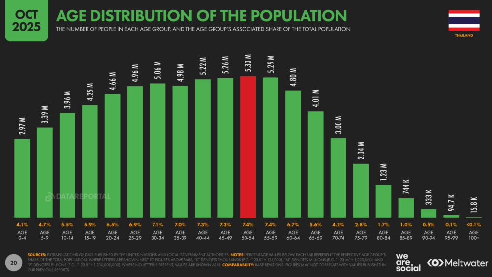 เป็นสัญญาณที่บ่งบอกว่า กลุ่มลูกค้ารายใหญ่จำนวนมากอาจไม่ใช่กลุ่ม Gen Z เสียทีเดียว เพราะปริมาณของกลุ่ม Gen X และ Gen Y เป็นกลุ่มที่มีปริมาณมากที่สุด โดยประชากรส่วนใหญ่ของประเทศไทยมีอายุเฉลี่ยอยู่ที่ 50-54 ปี โดยมีอยู่ถึง 5.33 ล้านคน ที่สำคัญยังเป็นกลุ่มที่เข้าถึงเทคโนโลยีและมีกำลังซื้อสูง