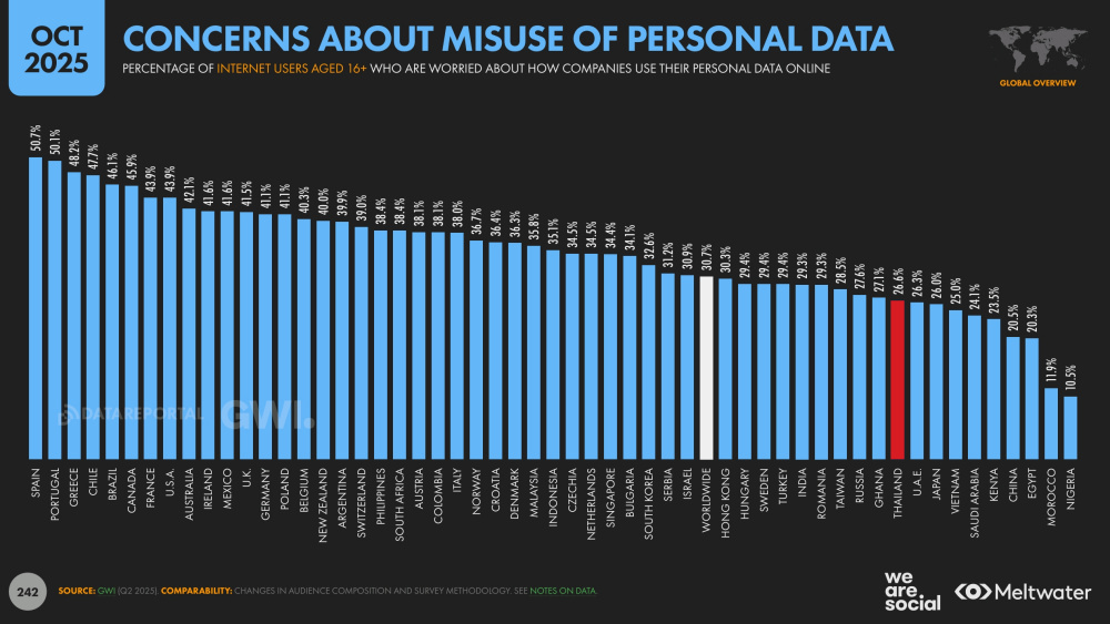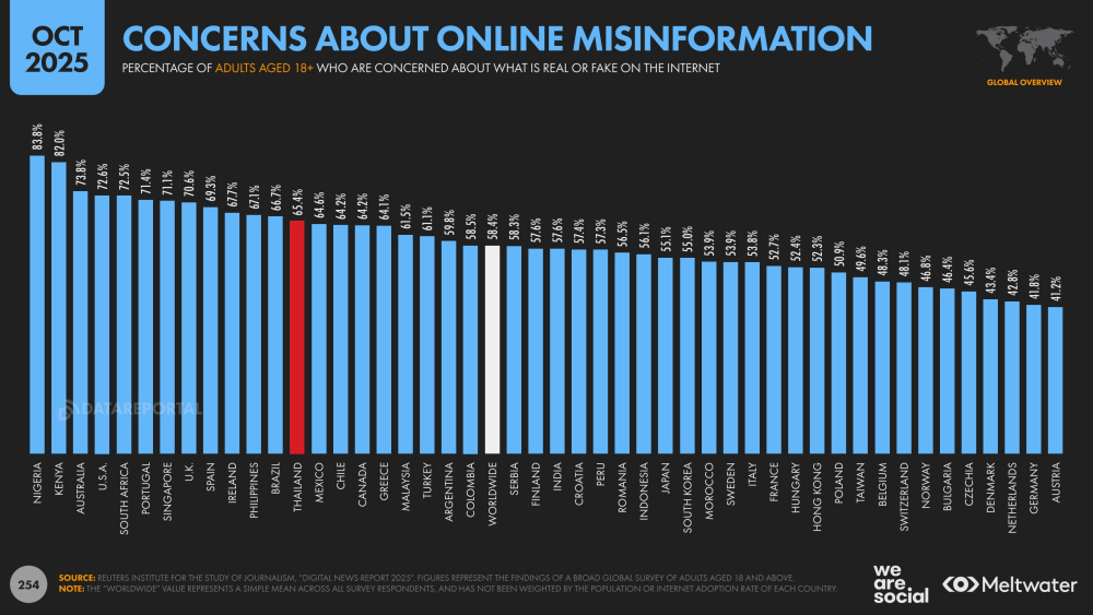 ข้อมูลเหล่านี้กำลังชี้ไปในทิศทางเดียวกัน คือการจัดเก็บข้อมูล แต่เพราะสถานการณ์การหลอกลวง (Scammer) ส่งผลต่อความกังวลเรื่องความปลอดภัย แต่สำหรับคนไทยความกังวลในกรณีดังกล่าวกลับมีรูปแบบพิเศษที่ไม่เหมือนชาติตะวันตก จากข้อมูลพบว่า 65.4% ของคนไทยกังวลเรื่อง “ข้อมูลเท็จ (Misinformation)” หรือข่าวปลอมบนอินเทอร์เน็ต แต่กลับกังวลเรื่องการที่บริษัทต่างๆ นำข้อมูลส่วนตัวไปใช้เพียง 26.6% เท่านั้น