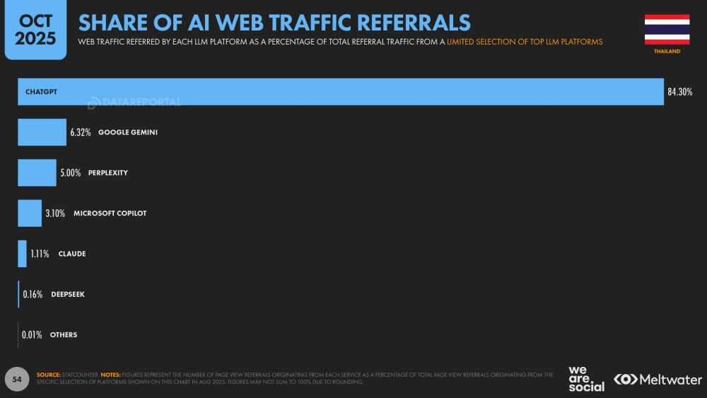 สำหรับ AI อย่าง ChatGPT ได้ก้าวขึ้นมาเป็น AI อันดับหนึ่งของโลกที่มีผู้ใช้บนมือถือถึง 557 ล้านบัญชี ครองส่วนแบ่งการส่งต่อทราฟฟิก (Referrals) ในกลุ่มเทคโนโลยี AI ถึง 80.92% ขณะที่ Google Gemini ตามาอย่างห่างๆ ในอันดับรองลงมาด้วยจำนวนผู้ใช้งานบนมือถือ 70.1 ล้านบัญชี และ Deepseek ของจีนที่มาแรงในอันดับสามด้วยจำนวนผู้ใช้งานบนมือถือถึง 59.9 ล้านบัญชี