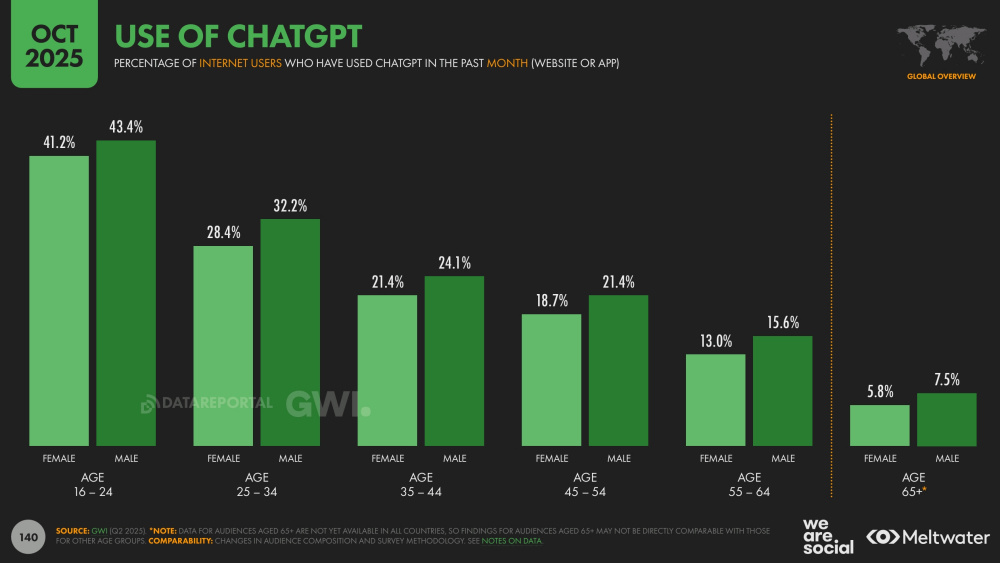เมื่อเจาะลึกลงไปในการใช้งาน AI พบว่า กลุ่มคนรุ่นใหม่อายุ 16-24 ปี โดยเฉพาะผู้ชายนิยมใช้ ChatGPT มากที่สุดถึง 43.4% โดยส่วนใหญ่มีการใช้เพื่อคลายเหงากว่า รองลงมาเป็นการใช้ในชีวิตประจำวัน และเพื่อค้นหาข้อมูลต่างๆ เมื่อเทียบกับข้อมูลของไทยก็พบว่าไปในทิศทางเดียวกับทั่วโลก โดยคนไทยเข้าถึงเว็บไซต์ AI มากที่สุดคือ ChatGPT สูงถึง 84.3% โดยที่ Google Gemini ยังคงทิ้งห่างเช่นเดิมที่ 6.32%