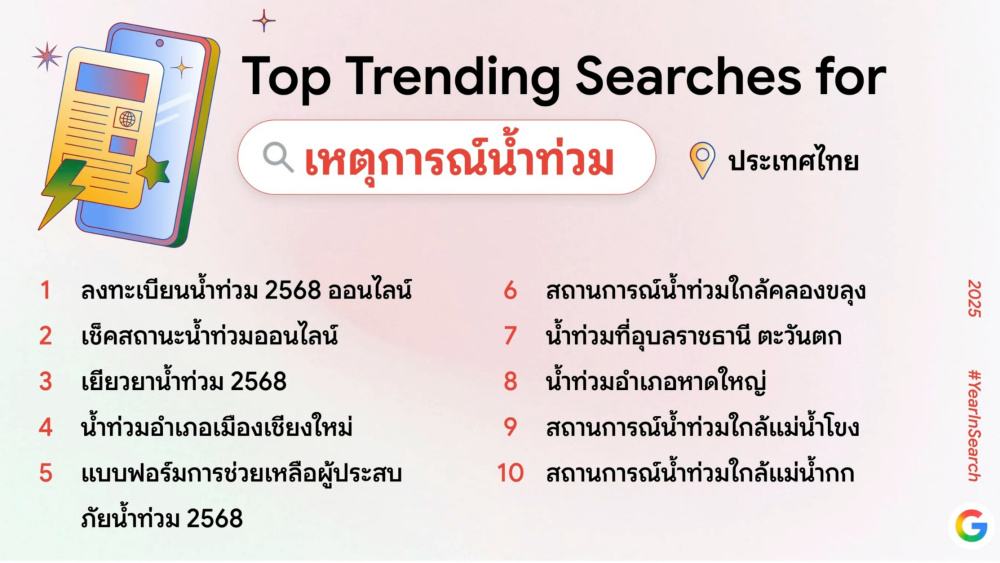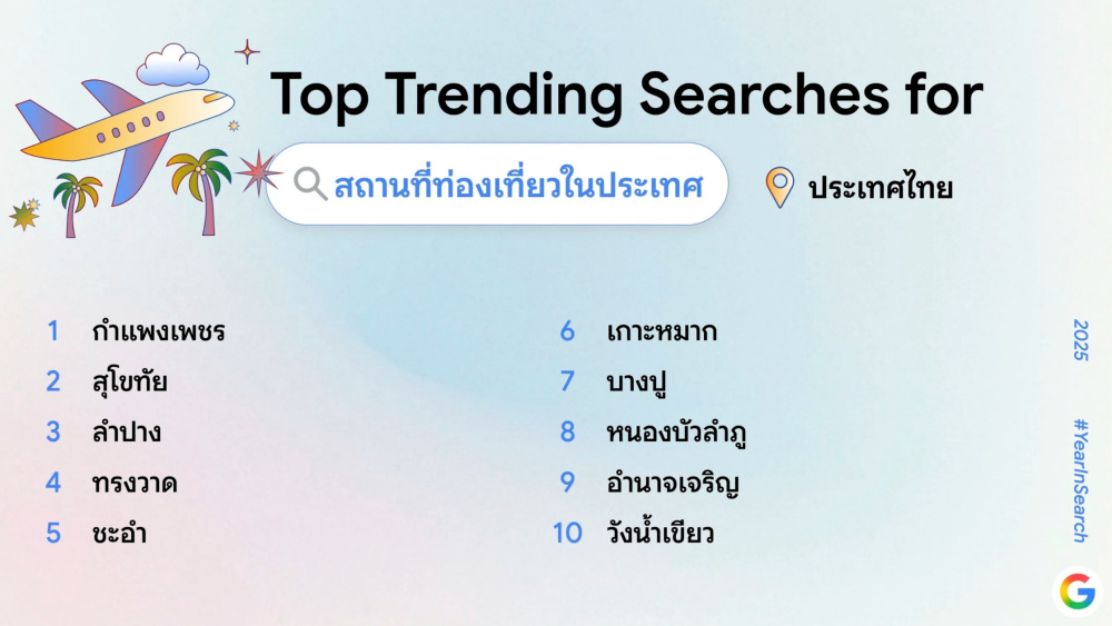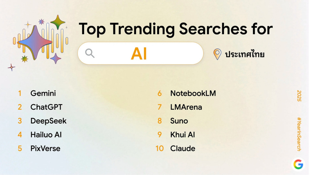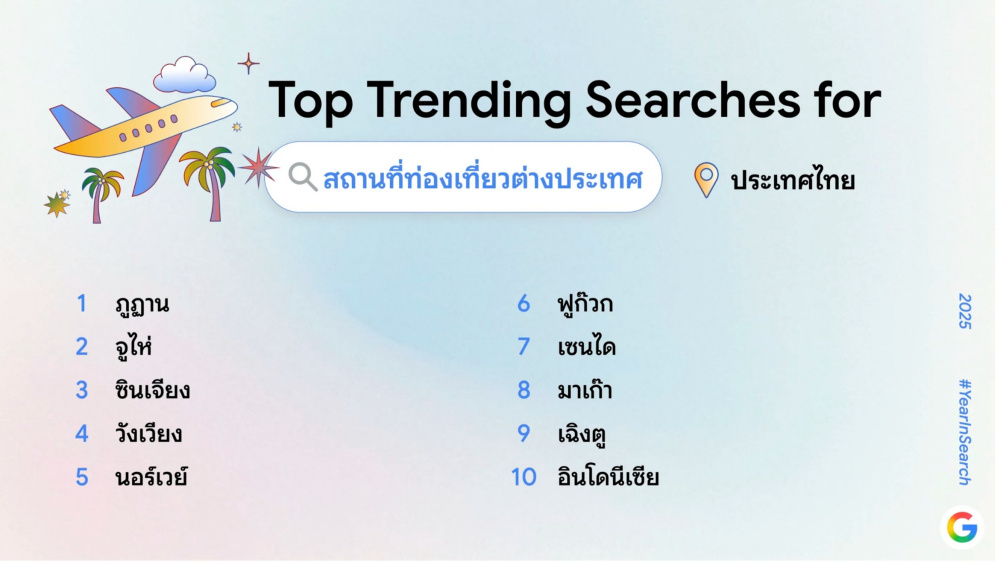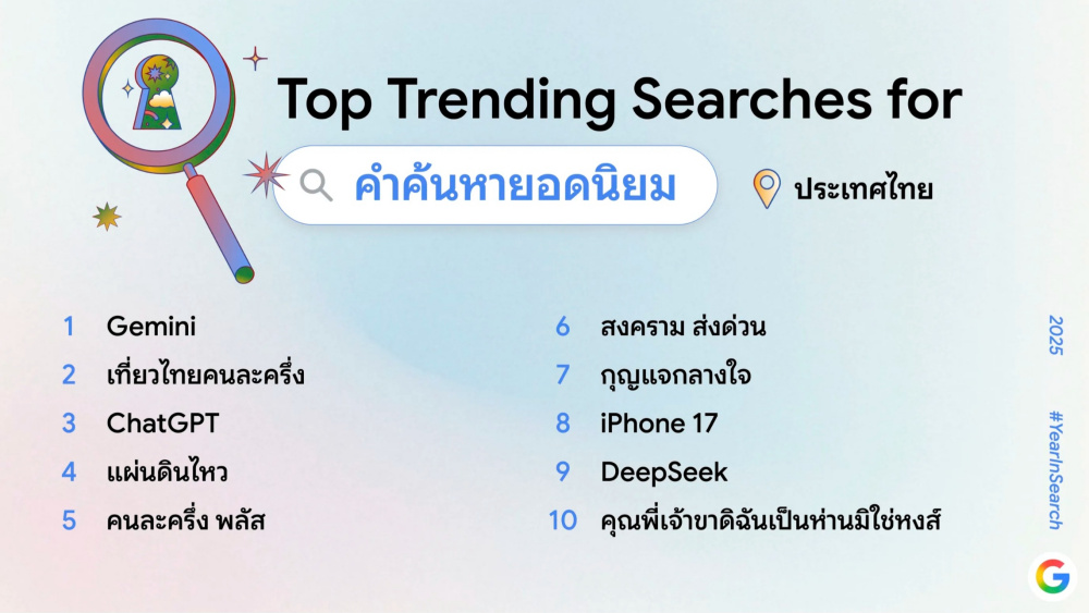 ใกล้สิ้นปีแล้ว Google ประเทศไทย ได้เผยรายงานผล “คำค้นหายอดนิยมในไทยประจำปี 2568 (Year in Search 2025)” รายงานสรุปคำค้นหายอดนิยมประจำปีที่สะท้อนภาพรวมความสนใจของคนไทยตลอดปี 2568 ไม่ว่าจะเป็นเหตุการณ์สำคัญที่เป็นกระแส เทรนด์ AI ที่มาแรงต่อเนื่อง บุคคลและข่าวเด่นที่ถูกพูดถึงทั่วประเทศ ตลอดจนเทรนด์ท่องเที่ยวทั้งในไทยและต่างประเทศ