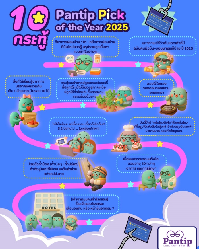 เราขอขอบคุณทุกคนที่ในหนึ่งปีที่ผ่านมา มีสมาชิกพันทิปได้เข้ามาแบ่งปันเรื่องราว ความรู้ กำลังใจ และประสบการณ์ดีๆ ให้แก่กันและเพื่อเป็นการขอบคุณที่สมาชิกมอบให้ต่อสังคมพันทิป เราจึงขอตอบแทนความรัก ด้วยการหาสุดยอดกระทู้ดีมีประโยชน์ ที่คอยสร้างกำลังใจ มาฝากเป็นของขวัญวันปีใหม่ในปี 2026 ให้กับทุกคน ด้วย 10 สุดยอดกระทู้ประจำปี 2025 ที่เต็มไปด้วยเรื่องราวจากสมาชิกแบบครบทุกไลฟ์สไตล์เราหวังว่ากระทู้ที่เราคัดเลือกในครั้งนี้ จะสร้างความประทับใจให้กับทุกคนนะ