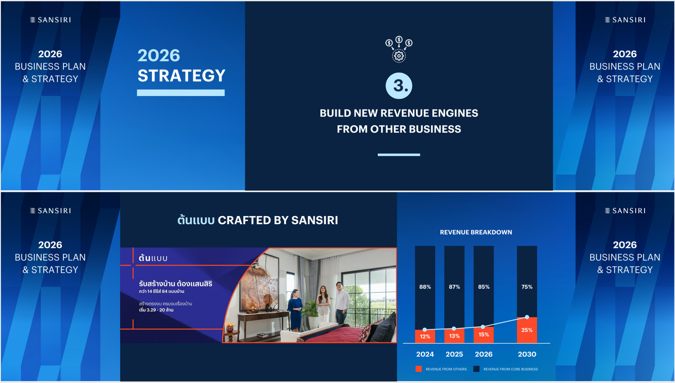 นี่คือสัญญาณว่า ขายบ้านอย่างเดียว ไม่รอดในระยะยาว ธุรกิจอสังหาฯ ผันผวนตามเศรษฐกิจเกินไป แสนสิริจึงต้องเร่งปั้นธุรกิจบริการ (เช่น ต้นแบบ Crafted by Sansiri, บริการทางการเงิน) เพื่อให้มีรายได้ประจำ (Recurring Income) เข้ามาพยุงบริษัทในช่วงที่เศรษฐกิจขาลง