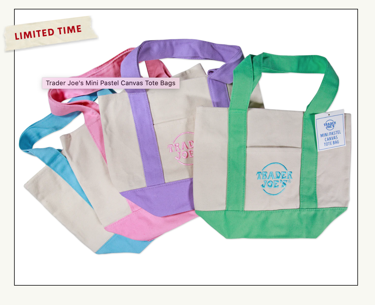 Trader Joe’s เริ่มจำหน่ายถุงผ้าแบบใช้ซ้ำได้มาตั้งแต่ปี 1977 แต่เมื่อเดือนกุมภาพันธ์ 2024 ทางร้านได้เปิดตัว Mini-tote ซึ่งสร้างกระแสไปทั่วอินเทอร์เน็ต โดยทางฝ่ายการตลาดของ Trader Joe’s ระบุว่า บริษัทได้ผลิตกระเป๋ามินิโท้ทออกมาหลายแสนใบ โดยคาดว่าจะขายได้นานหลายสัปดาห์หรือเป็นเดือน แต่ปรากฏว่าสินค้าทั้งหมดถูกกวาดเกลี้ยงแผงภายในเวลาเพียงสัปดาห์เดียว