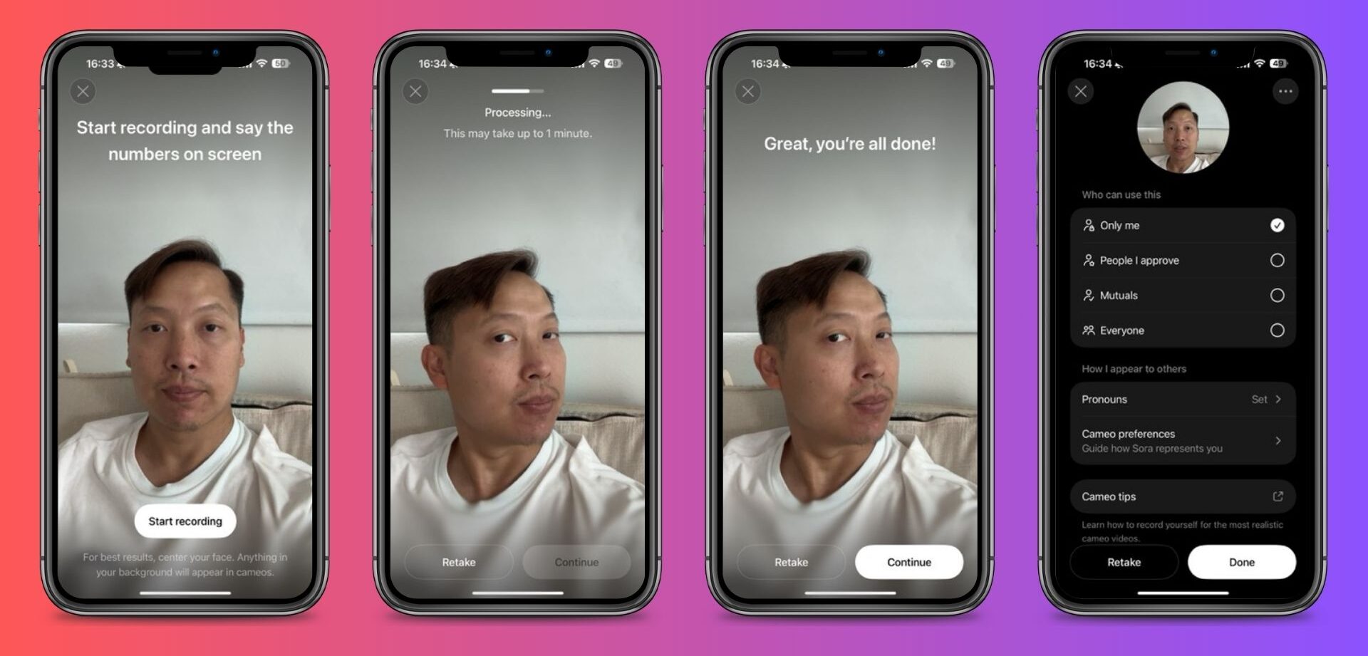 1. Cameo: สามารถใส่ใบหน้าและเสียงของเราในวิดีโอ AI ได้ หลังจาก Log-in เข้าไปแล้วระบบจะให้เราเซลฟี่วิดีโอสั้นๆ เพื่อให้ระบบจดจำใบหน้าและเสียงของเราเอาไว้ จากนั้นเราสามารถสั่งให้ Sora สร้างวิดีโอได้ตามต้องการโดยมีตัวเราเป็นนักแสดงได้