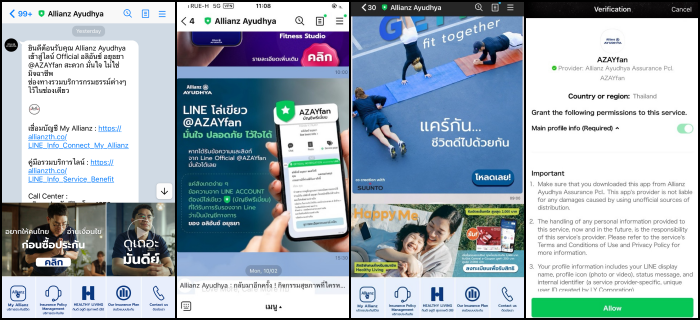 Allianz Ayudhya ยังเชื่อมต่อระบบบริการของตนเข้ากับ LINE ผ่านแอป My Allianz ที่ให้ลูกค้าจัดการกรมธรรม์ ตรวจสอบการเคลม หรือจ่ายเบี้ยได้ด้วยตัวเอง พร้อมลิงก์ต่อไปยังเว็บไซต์ Healthy Living ที่ชวนให้ทุกคนดูแลตัวเองในมิติ Eat, Live, Health และ Wealth สะท้อนแนวคิดของแบรนด์ที่อยากให้ “การมีประกัน” เป็นเพื่อนร่วมทางที่ช่วยดูแลสุขภาพและชีวิต มากกว่าจะเป็นสิ่งที่ใช้เมื่อถึงยามจำเป็น