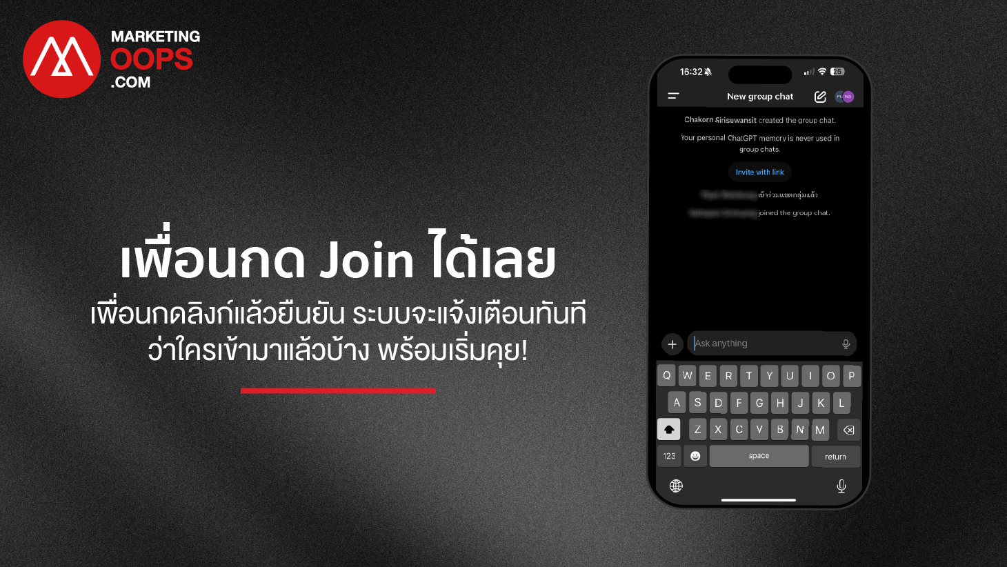 - เมื่อเพื่อนกดลิงก์ จะเข้ามาในห้องแชททันที เน้นว่าเพื่อนต้องมีบัญชี OpenAI ด้วย