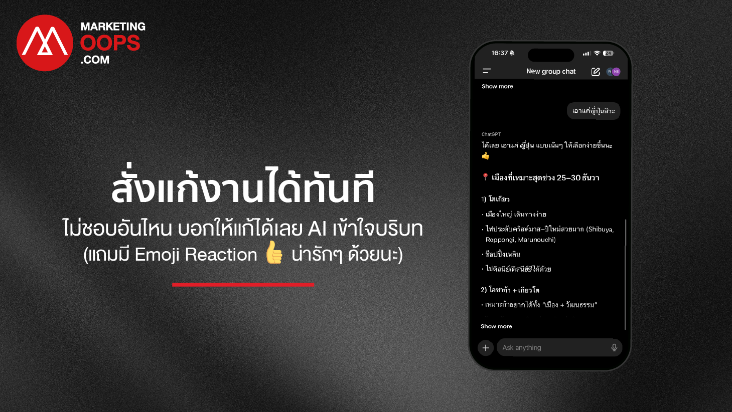 ยกตัวอย่างสถานการณ์ ทีม Creative และ AE กำลังตันกับไอเดียเปิดตัวสินค้าใหม่จากเดิมที่ต่างคนต่างไปถาม AI ของตัวเอง แล้วเอามาขิงกันในห้องประชุม แต่ด้วยฟีเจอร์นี้เราสามารถลากทุกคนเข้า Group Chat แล้วโยนบรีฟสินค้าลงไป ให้ ChatGPT ช่วยเป็น “Creative Director” คนกลาง