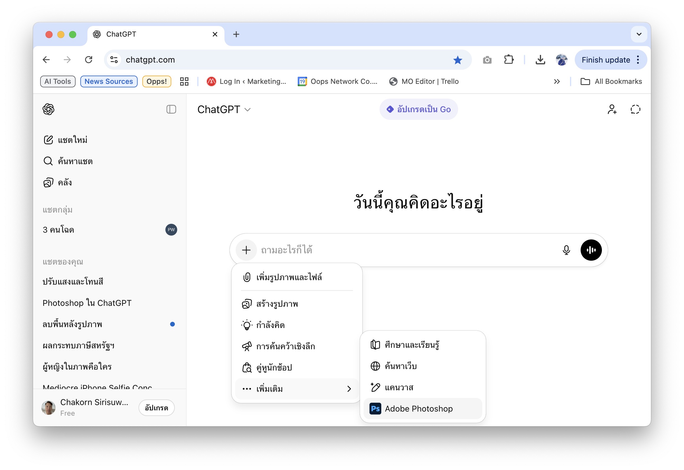 เมื่อเชื่อมต่อสำเร็จแล้วในหน้าต่างการใช้งานกดเครื่องหมาย + จะเห็น Drop Down ลงมา กด “เพิ่มเติม” ก็จะเห็นแอป Adobe Photoshop ให้เรียกใช้งาน หรือถ้าไม่ทำแบบนี้เวลา Chat เรา เรียก Adobe Photoshop แล้วก็ Prompt ต่อได้เลยก็ได้