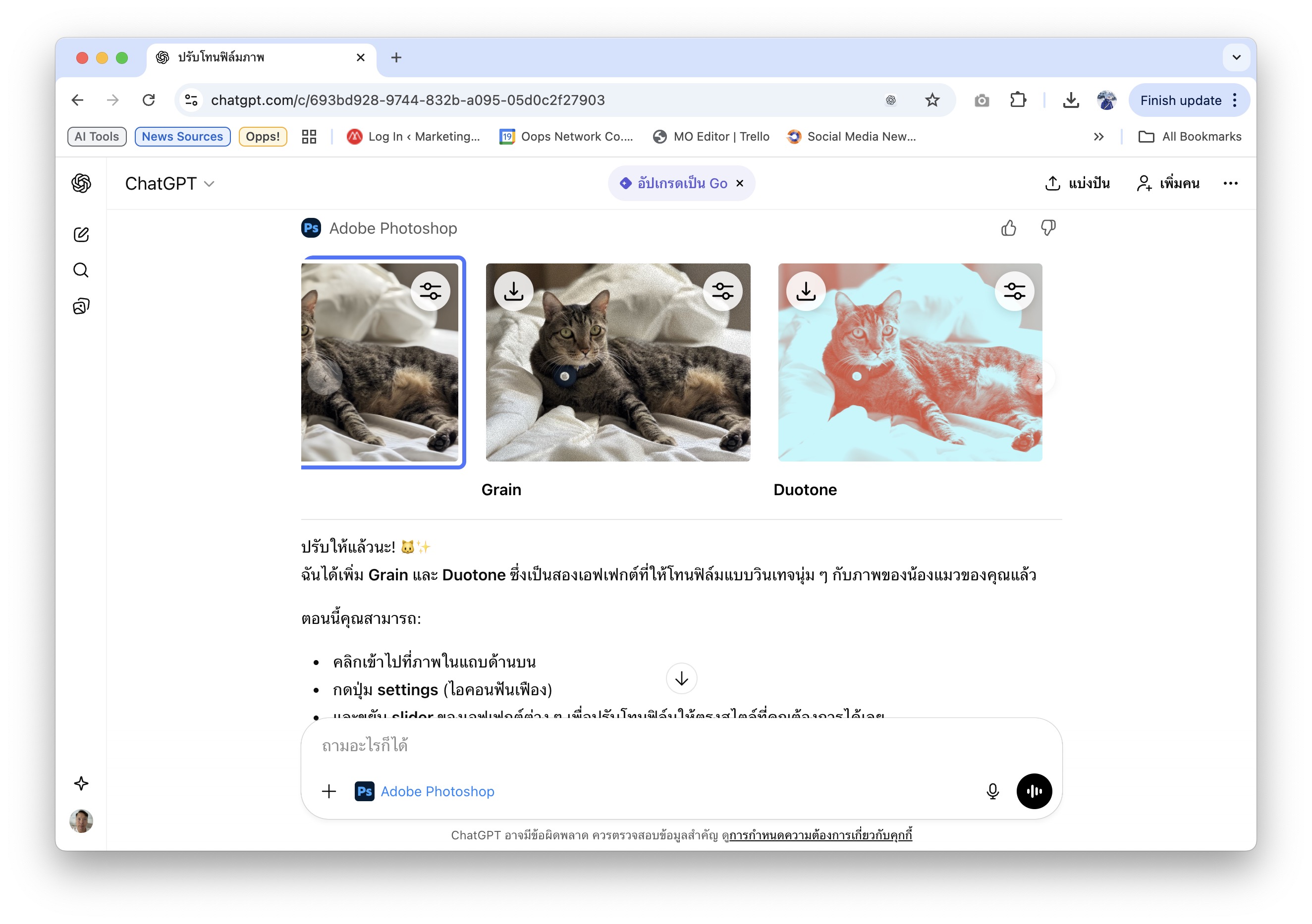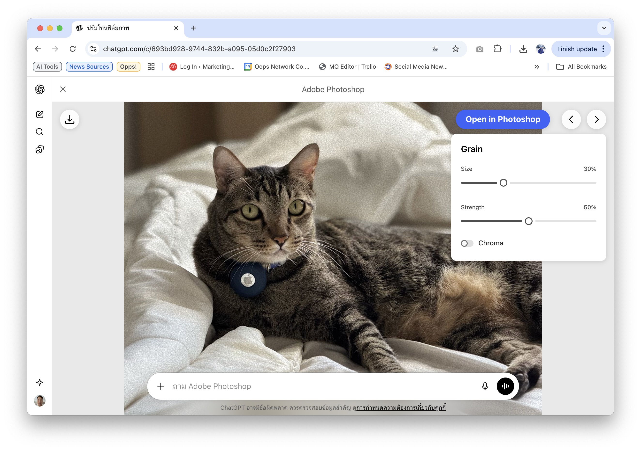 หลังจากที่ AI คู่แข่งอย่าง Gemini จาก Google ได้อัปเดตฟีเจอร์ใหม่ ๆ มาอย่างต่อเนื่อง ล่าสุด ChatGPT เองก็เร่งอัพเดทด้วยเหมือนกันด้วยใส่ความสามารถของ Adobe Photoshop รวมถึง Photoshop Express และ Acrobat เข้าไปใน ChatGPT ด้วยทำให้สามารถใช้งานการแก้ไขภาพหรือสร้างสรรค์การกราฟฟิคได้ง่ายและแม่นยำมากขึ้น
