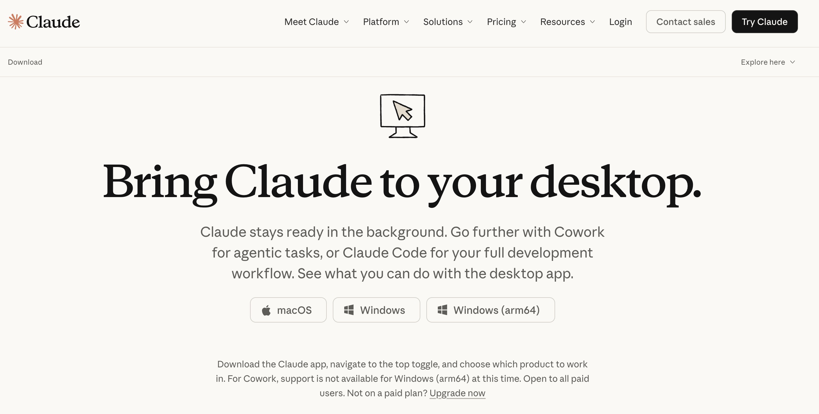 การใช้งาน Claude Cowork จะอยู่ในรูปแบบของโปรแกรม Desktop เท่านั้น (ปัจจุบันรองรับทั้ง macOS และ Windows) และสงวนสิทธิ์ให้เฉพาะผู้ใช้งานแบบเสียเงิน (แพลน Pro, Max, Team) เท่านั้นวิธีติดตั้ง