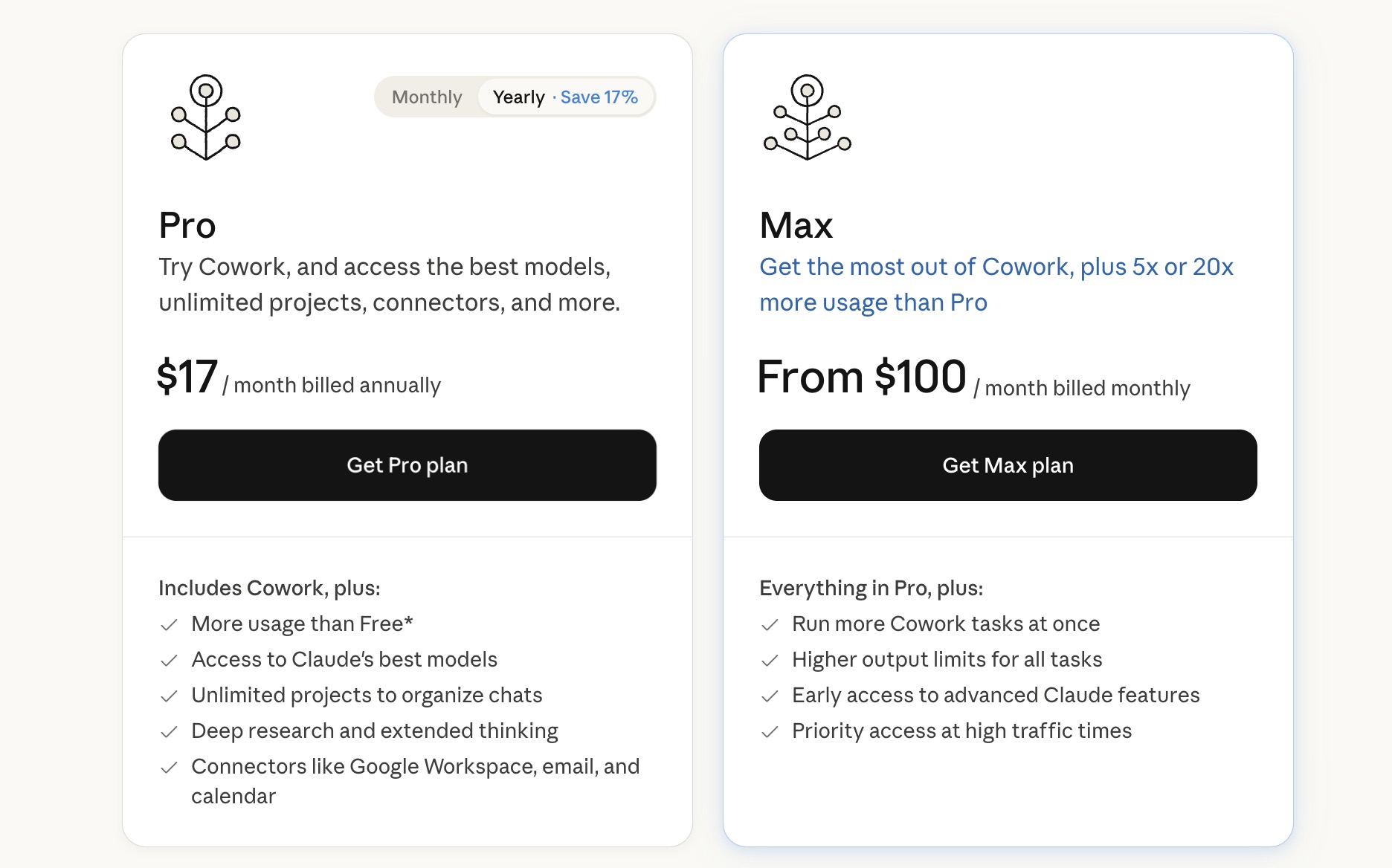 การจะใช้งาน Cowork ได้ เราต้องเป็นผู้ใช้งานแบบเสียเงินในแพลน Pro หรือ Max เท่านั้นโดย