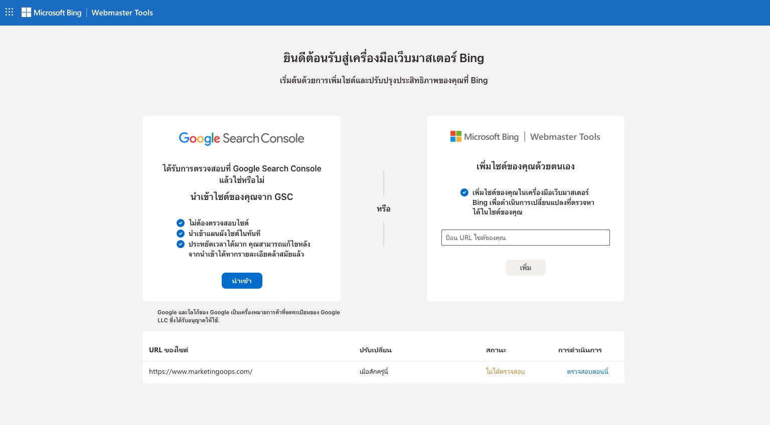3. ระบบจะนำเข้ามาสู่หน้า Bing Webmaster Tools ให้ใส่ URL เว็บไซต์ที่ต้องการดูข้อมูลและกดเพิ่ม