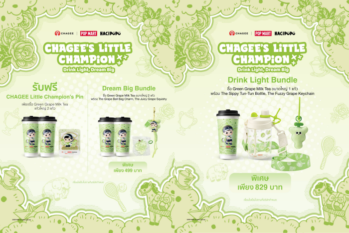 CHAGEE และ POP MART พร้อมชวนทุกคนมาสนุกไปกับการดื่มชารสชาติใหม่ Green Grape Milk Tea ที่สดชื่นทั้งกายและใจ ฉลองชัยชนะเล็กๆ ในแต่ละวัน พร้อมสะสมของน่ารักสุดเอ็กซ์คลูซีฟจาก HACIPUPU ที่จะทำให้ทุกช่วงเวลาของทุกคนสดชื่น สดใส และสนุกกว่าที่เคย