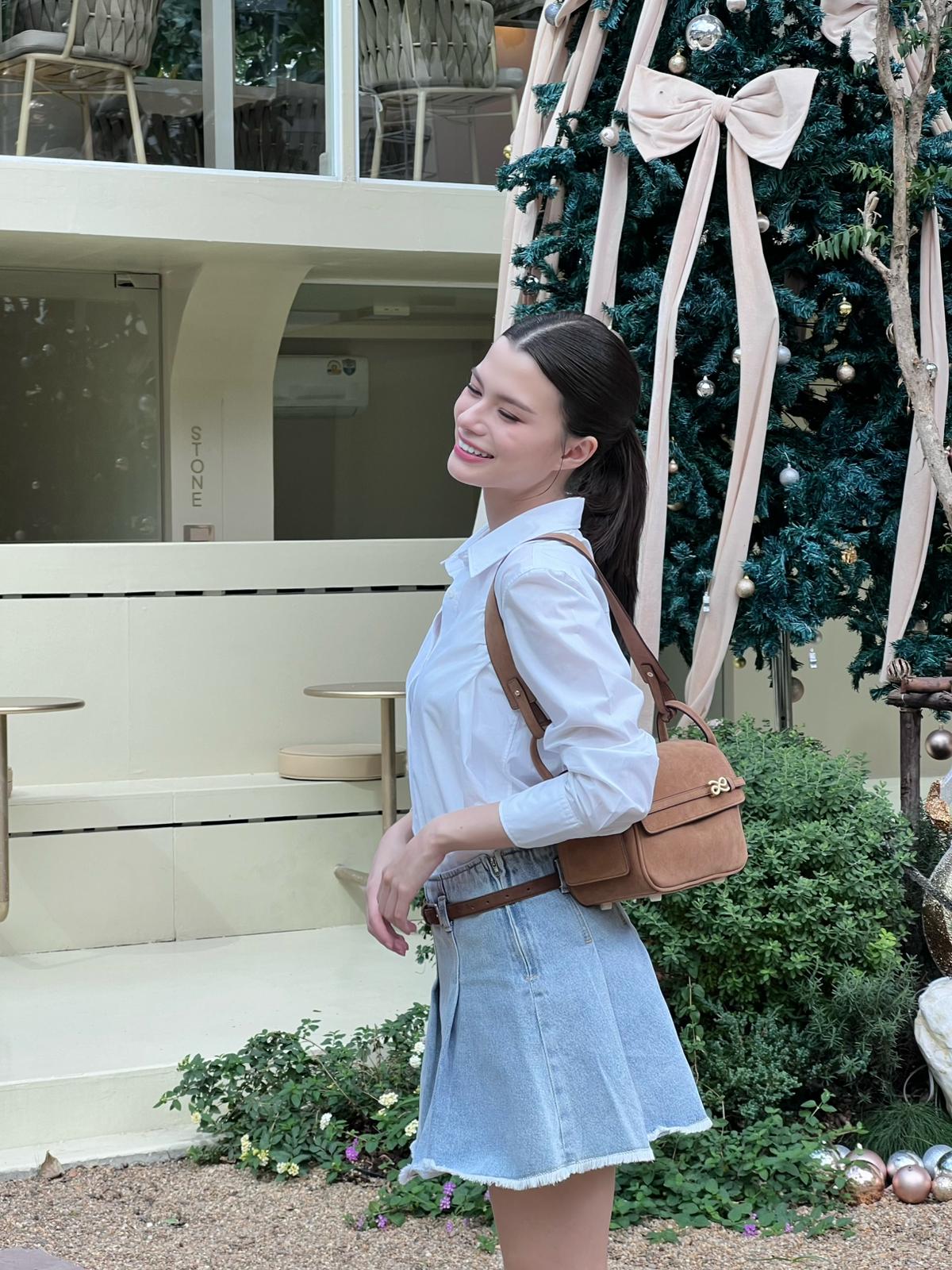 - คุณออม กรณ์นภัส กับการมิกซ์แอนด์แมตช์คู่สีสุดชิค กางเกงยีนส์สีน้ำตาลมอคค่า และ กระเป๋า TREASURE BELT SUEDE สี GRASS
