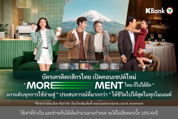 บัตรเครดิตกสิกรไทยตอกย้ำภาพลักษณ์บัตรเครดิตยุคใหม่ เดินหน้าขับเคลื่อนแบรนด์สู่การเป็น “มากกว่าการใช้จ่าย” ผ่านแนวคิด “MOREMENT ไหน ก็ไปได้อีก” เพื่อตอบรับพฤติกรรมผู้บริโภคยุค Value-First ที่ให้ความสำคัญทั้งความคุ้มค่าและคุณภาพของประสบการณ์ กสิกรไทยจึงยกระดับบทบาทของบัตรเครดิต จากเครื่องมือทางการเงิน สู่ “ตัวช่วยในการสร้างประสบการณ์ชีวิต” ด้วยการออกแบบบัตรที่หลากหลาย พร้อมสิทธิประโยชน์ที่ตอบโจทย์ลูกค้าในทุกเซ็กเมนต์ ครอบคลุมไลฟ์สไตล์ต่างๆ ในทุกโมเมนต์ของชีวิต ไม่ว่าจะเป็นดีลคุ้มสำหรับการช้อปออนไลน์ การสะสมและแลกคะแนนสะสมเพื่อรับรางวัลและประสบการณ์พิเศษผ่าน K PLUS รวมถึงโอกาสในการเข้าถึงประสบการณ์ไลฟ์สไตล์ระดับเวิลด์คลาส