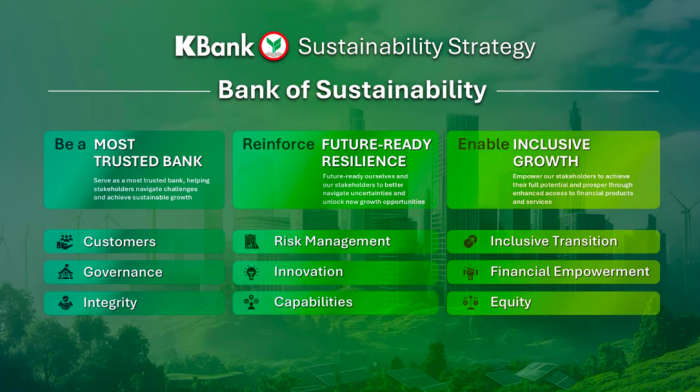 ยุทธศาสตร์นี้ไม่เพียงกำหนดทิศทางของธนาคาร แต่ยังเป็นกรอบที่ช่วยให้การเติบโตของ KBank เดินไปพร้อมกับการสร้างคุณค่าทางเศรษฐกิจและสังคมในเวลาเดียวกัน