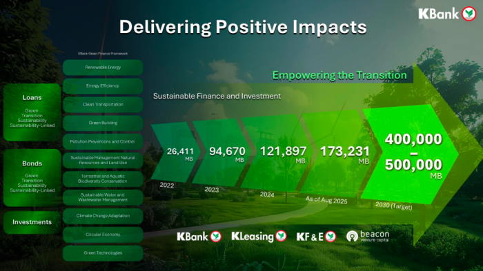 ณ สิ้นเดือนสิงหาคมปีนี้ KBank ได้ส่งมอบสินเชื่อและเงินลงทุนเพื่อความยั่งยืนไปแล้วกว่า 173,000 ล้านบาท ช่วยลดการปล่อยก๊าซเรือนกระจกไปแล้วกว่า 2.74 ล้านตันคาร์บอนไดออกไซด์เทียบเท่า ครอบคลุมตั้งแต่สินเชื่อรถยนต์ไฟฟ้า อาคารสีเขียว ไปจนถึงโครงการพลังงานสะอาดและธุรกิจที่ปรับตัวเพื่อความยั่งยืน