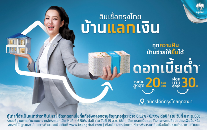 * สินเชื่อกรุงไทยบ้านแลกเงิน มีอัตราดอกเบี้ยที่แท้จริงตลอดอายุสัญญาอยู่ระหว่าง 6.52% – 6.77% ต่อปี (ณ วันที่ 8 ก.ย. 68) ซึ่งมีสมมติฐานการคำนวณมาจากอัตราดอกเบี้ย MLR = 6.50% ต่อปี (ณ วันที่ 15 ส.ค. 68) นอกจากนี้ อัตราดอกเบี้ยลอยตัวสามารถเปลี่ยนแปลงเพิ่มขึ้นหรือลดลงได้ โดยเงื่อนไขและหลักเกณฑ์การพิจารณาสินเชื่อเป็นไปตามที่ธนาคารกำหนด ดูรายละเอียดเพิ่มเติมและการคำนวณได้ที่ www.krungthai.com