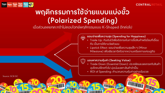 นำมาสู่ Insight ที่สะท้อนพฤติกรรมผู้บริโภคที่อาจเรียกได้ว่าเป็น “Polarized Spending” หรือถ้าจะให้เห็นภาพชัดคือ ผู้บริโภคจะแบ่งกระเป๋าเงินตัวเองออกเป็นสองฝั่ง