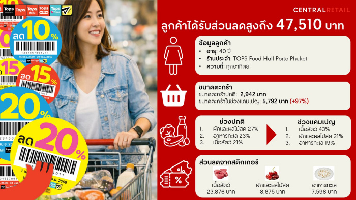 แต่ในช่วงระยะเวลาของแคมเปญสัดส่วนของสินค้ากลับเปลี่ยนไป โดยมีสัดส่วนของ เนื้อสัตว์สูงถึง 43%, ผักและผลไม้สด 21% และอาหารทะเล 19% คิดเป็นส่วนลดรวมกว่า 47,510 บาท ที่สำคัญตลอดช่วงระยะเวลาแคมเปญผู้บริโภครายดังกล่าวมีการใช้จ่ายรวมกว่า 3 แสนบาท