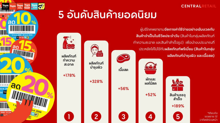 ยิ่งไปกว่านั้นข้อมูลยังแสดงให้เห็นถึง 5 อันดับสินค้ายอดนิยม โดยมีผลิตภัณฑ์ทำความสะอาด มาเป็นอันดับ 1 เติบโตถึง 178% รองลงมาจะเป็นกลุ่มผลิตภัณฑ์บำรุงผิวที่เติบโตสูงที่สุดถึง 328% เนื่องจากเป็นกลุ่มผลิตภัณฑ์ที่สามารถเก็บไว้ได้นานและมีมูลค่าสูงผู้บริโภคจึงนิยมซื้อเก็บตุนเอาไว้ ในขณะที่อันดับ 3 จะเป็นกลุ่มสินค้าเนื้อสดที่เติบโตขึ้นถึง 50% ตามมาด้วยกลุ่มผลิตภัณฑ์ผักและผลไม้สดเติบโตตามมาติดๆ ที่ 52% และกลุ่มสินค้าบรรจุสำเร็จที่เติบโตถึง 189%