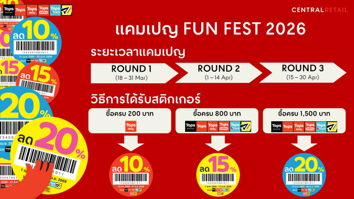 สำหรับแคมเปญ TOPS Fun Fest ในปี 2026 นี้เข้าสู่ช่วงโค้งสุดท้าย แต่เมื่อคลี่แคมเปญนี้ออกมาอย่างละเอียดจะพบว่า การแบ่งออกเป็น 3 เฟสย่อย ถูกออกแบบมาเป็นขั้นบันไดเพื่อสร้างความถี่กระตุ้นยอดซื้อ เริ่มตั้งแต่เมื่อช้อปครบ 200 บาทเฉพาะที่ท็อปส์ เดลี่รับส่วนลด 10% ขยับขึ้นมาที่ช้อปครบ 800 บาทรับส่วนลด 15% และสุดท้ายเมื่อช้อปครบ 1,500 บาท จะได้ส่วนลดสูงสุดถึง 20% โดยสามารถใช้ได้ทั้งสติ๊กเกอร์กระดาษหน้าร้าน และ E-Sticker บนแอปพลิเคชัน