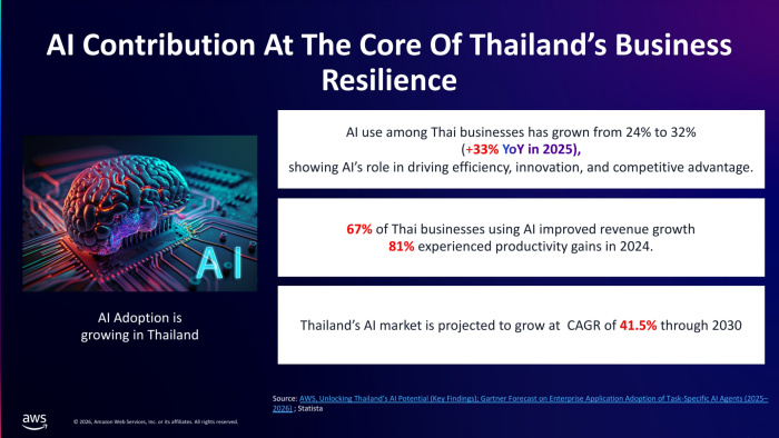 ถึงอย่างนั้นก็ยังมีความสงสัยในความเชื่อมั่นของระบบ Agentic AI นั่นคือโอกาสที่ทำให้ AWS หรือ Amazon Web Services เข้ามาเขย่าตลาด เนื่องจากข้อมูล Insight พบว่า เศรษฐกิจดิจิทัลของประเทศไทย คาดว่าจะเติบโตขึ้น 4.2% ในปี 2026 และธุรกิจไทยมีการใช้งาน AI เพิ่มขึ้นจากปี 2024 ที่มีเพียง 24% มาเป็น 32% ในปี 2025 คิดเป็นอัตราเติบโตถึง 33% หรือในทุกๆ 3 นาที จะมี 1 บริษัทในไทยที่เริ่มนำ Enterprise AI เข้าไปฝังในระบบการทำงาน