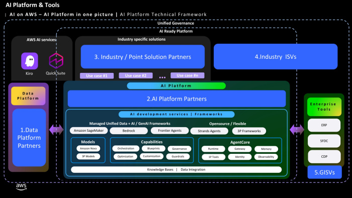 ทีนี้เมื่อถอดรหัส Framework ของ AI หนึ่งตัวจะพบว่า มีการทำงานอยู่ 5 ส่วนหลัก โดยส่วนแรกจะเป็น Data Platform Partners เป็นส่วนฐานรากที่สำคัญที่สุดเพราะ AI ต้องหาอาหารข้อมูลเพื่อกิน ถ้าไม่มีข้อมูล AI ก็ไร้ความหมาย ส่วนต่อมาจะเป็นส่วนของ AI Platform Partners ซึ่ง AWS มีเครื่องมืออย่าง Amazon Bedrock, SageMaker และ Amazon Nova รวมถึง AgentCore (Runtime, Memory, Guardrails) ที่เปรียบเสมือนสมองและอวัยวะให้ AI ทำงานได้