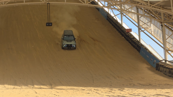 และฐานสุดท้ายคือ เนินภูเขาทราย ที่ได้รับการบันทึกจาก Guinness World Records ว่าเป็นสนามทดสอบเนินทรายที่สูงเอบ 30 เมตรกับความชัน 28 องศาและใหญ่ที่สุดในโลก การไต่ขึ้นภูเขาทรายที่พื้นผิวร่วนซุยไม่ใช่เรื่องง่าย แต่เป็นบทพิสูจน์สมรรถนะขั้นสูงสุดที่รถคันหนึ่งจะทำได้ โดยทั้ง 2 ฐานการทดสอบจะทำการทดสอบโดยผู้เชี่ยวชาญที่ถูกฝึกมาเป็นพิเศษเท่านั้นเพื่อความปลอดภัย