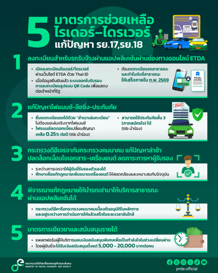 นายไชยชนก ชิดชอบ รัฐมนตรีว่าการกระทรวงดิจิทัลเพื่อเศรษฐกิจและสังคม (MDES) กล่าวว่า “ประกาศเรื่องรถรับจ้างผ่านระบบอิเล็กทรอนิกส์ (รย.17 และ รย.18) ส่งผลกระทบโดยตรงต่อผู้ขับขี่กว่า 200,000 รายที่เป็นฟันเฟืองสำคัญของเศรษฐกิจดิจิทัล กระทรวงฯ รับทราบถึงข้อกังวลและอุปสรรคหน้างาน ทั้งเรื่องเอกสารสิทธิ์ รถติดไฟแนนซ์ ค่าใช้จ่ายประกันภัยที่สูงขึ้น รวมถึงข้อจำกัดทางเทคนิคต่างๆ หลังจากรับข้อร้องเรียนมาแล้ว กระทรวงดีอีจึงไม่ได้นิ่งนอนใจและได้เร่งหารือกับกรมการขนส่งทางบก, ETDA สถาบันการเงิน และภาคเอกชน จนได้แนวทางแก้ไขปัญหาเร่งด่วน 5 มาตรการ เพื่อช่วยปลดล็อกผู้ประกอบอาชีพขับรถรับจ้างผ่านแอปพลิเคชันให้สามารถเข้าสู่ระบบได้อย่างถูกต้องและเป็นธรรม”