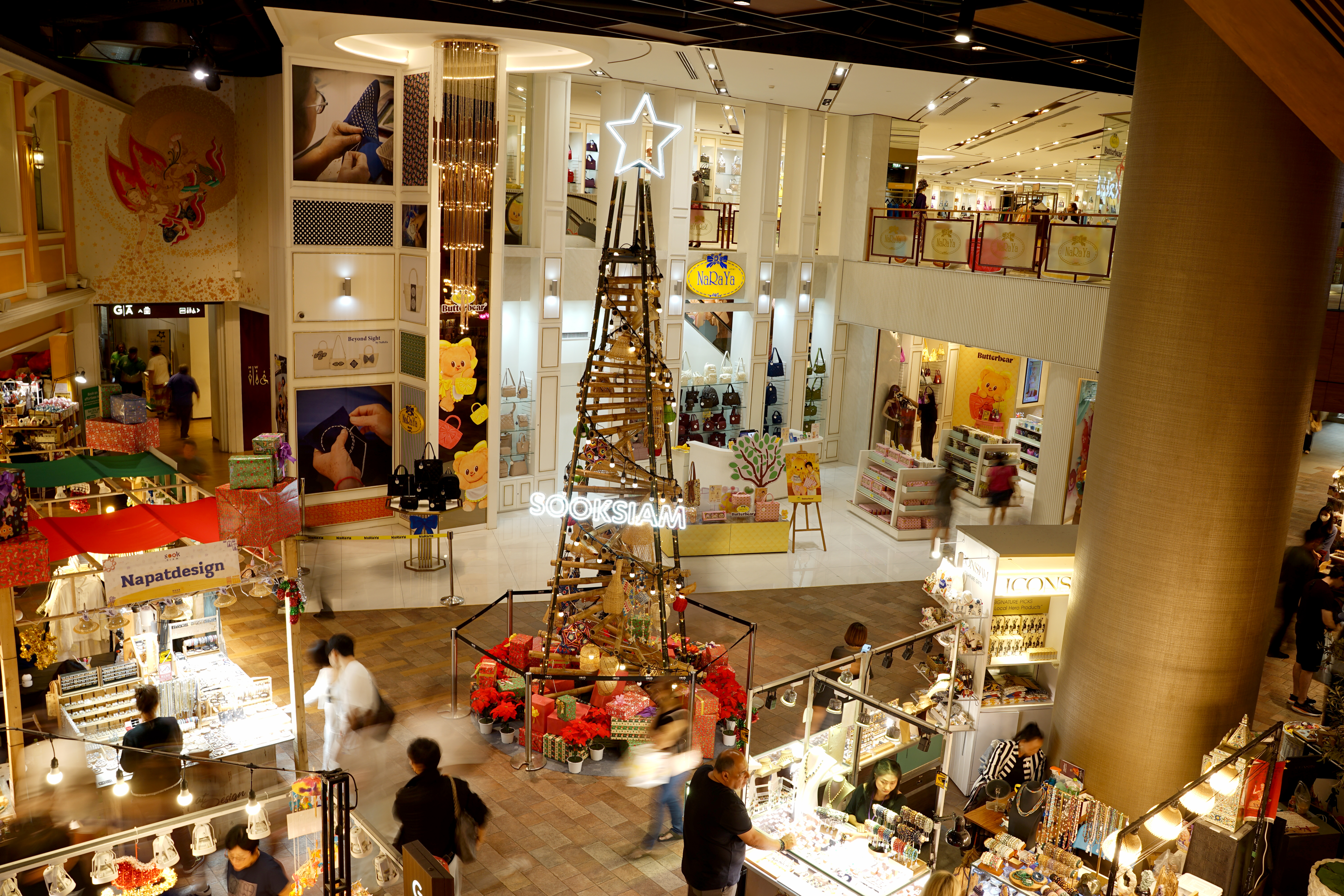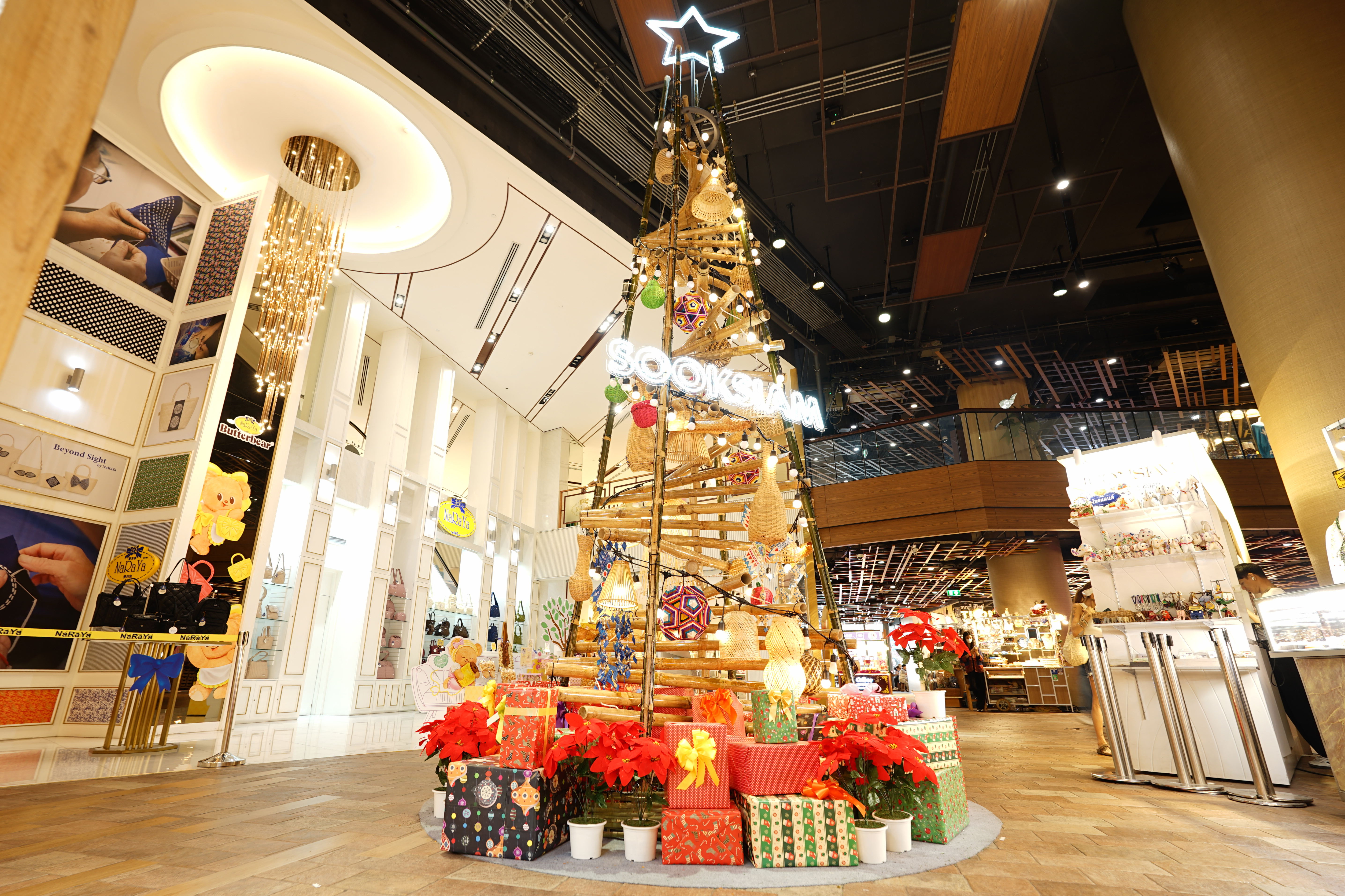 อีกหนึ่งไฮไลท์พิเศษคือการสร้างสรรค์ “ต้นคริสต์มาสภูมิปัญญาไทย” ที่ปีนี้นำเสนอภายใต้แนวคิด “ต้นคริสต์มาสไม้ไผ่ – ส่องประกายเสน่ห์วิถีชุมชนไทย ผ่านงานจักสานพื้นบ้าน” ผลงานสร้างสรรค์ที่งดงามและเปี่ยมด้วยจิตวิญญาณแห่งภูมิปัญญาท้องถิ่นไทย ด้วยไม้ไผ่จริงทั้งต้น ใช้เทคนิคการตอก มัด และหมุนเกลียวอย่างประณีต ประดับตกแต่งด้วยงานจักสานพื้นบ้านที่สื่อความหมายมงคล และสะท้อนลึกวิถีท้องถิ่นไทยอย่างลึกซึ้ง เช่น สุ่มไก่ สัญลักษณ์ของความอุดมสมบูรณ์และความขยันขันแข็ง, สุ่มปลาและปลาตะเพียน เครื่องรางแห่งความโชคดี นอกจากนี้ยังมีปลาช่อนจักสาน, ไทรดักปลาประมงพื้นบ้าน, ชะลอม, ตุงอิสาน, โคมไฟจักสานชนิดต่างๆ, แมงกระพรุนที่ทำจากไม้ไผ่ และงานประดิษฐ์รูปทรงต่าง ๆ ที่ทำจากหวายและไม้ไผ่ ซึ่งไม่เพียงสะท้อนวิถีชีวิตวัฒนธรรมอันงดงาม ยังส่งเสริมภูมิปัญญาท้องถิ่นไทยให้เป็นที่รู้จักอย่างกว้างขวางต่อสายตานักท่องเที่ยวจากทั่วโลก