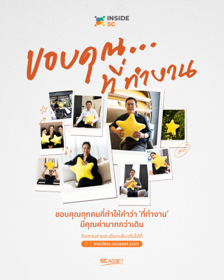 บริษัท เอสซี แอสเสท คอร์ปอเรชั่น จำกัด (มหาชน) หรือ SC Asset ผู้นำอสังหาริมทรัพย์คุณภาพสูงและมีนวัตกรรม เดินหน้าสร้าง “องค์กรที่ใส่ใจคนทำงาน” อย่างต่อเนื่อง ล่าสุดเปิดตัวแคมเปญ “Inside SC | ขอบคุณ…ที่ทำงาน” ภายใต้แนวคิด “Gratitude Mindset – คำขอบคุณที่เปลี่ยนบรรยากาศการทำงานให้มีหัวใจ” เพื่อปลุกพลังบวกในที่ทำงาน และสร้างวัฒนธรรมแห่งการเห็นคุณค่าซึ่งกันและกันในองค์กร สะท้อนเจตนารมณ์ของ SC Asset ที่มุ่งสร้างแบรนด์ในใจลูกค้าไปพร้อมกับการสร้างแบรนด์ในใจ “คนทำงาน” โดยเชื่อว่า “คน” คือรากฐานสำคัญในการขับเคลื่อนองค์กรให้เติบโตอย่างยั่งยืน