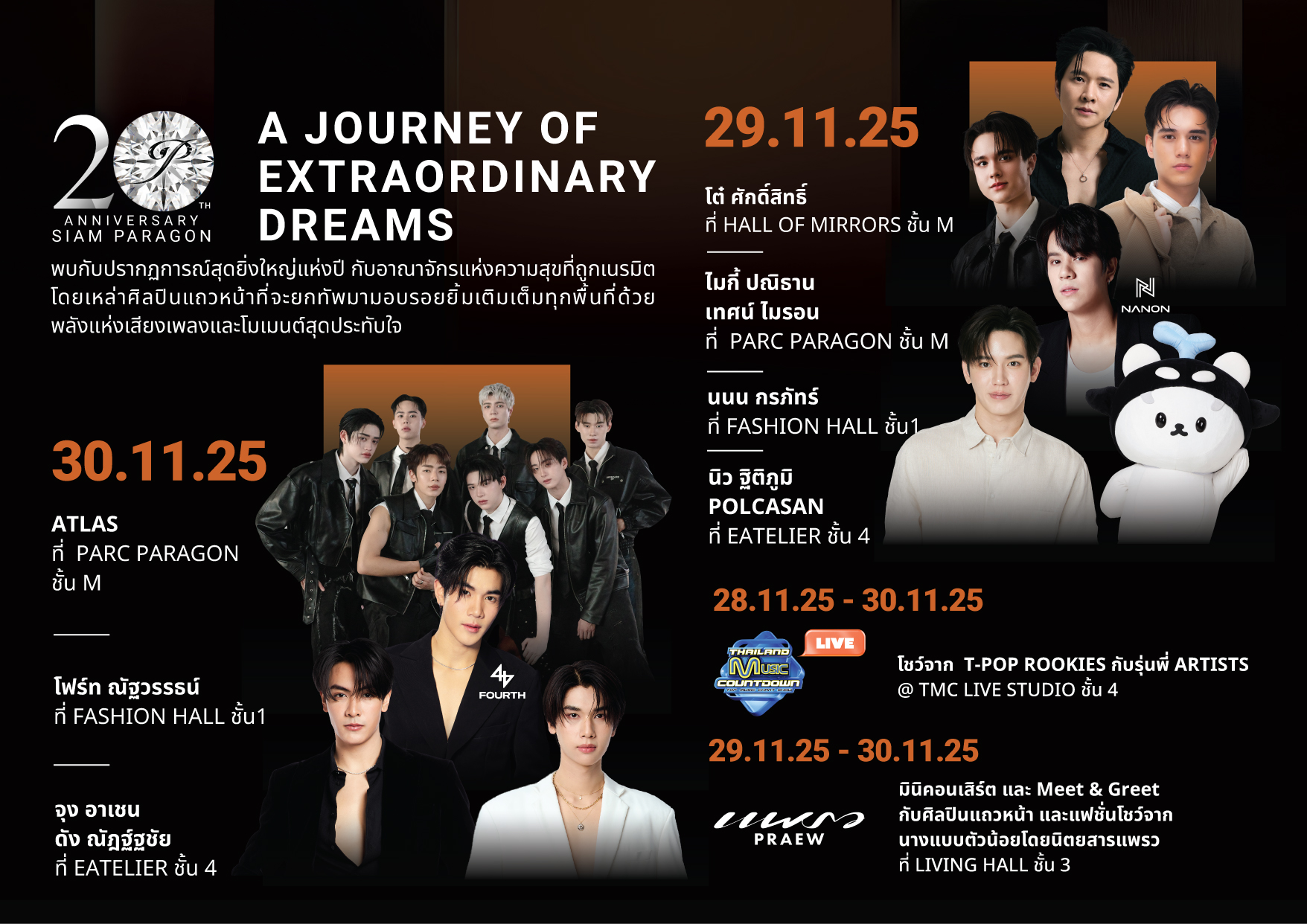 สยามพารากอน ฉลองครบรอบ 20 ปีสุดยิ่งใหญ่ ผนึกกำลัง ศูนย์ฯ ห้างฯ และพันธมิตร สร้างปรากฏการณ์ “A Journey of Extraordinary Dreams” เนรมิตพื้นที่แห่งความสุขทุกตารางเมตร จัดเต็มความบันเทิงจากศิลปินชั้นนำกว่า 70 ชีวิต พร้อมมอบประสบการณ์เหนือระดับด้วยโปรโมชั่นและกิจกรรมสุดพิเศษ