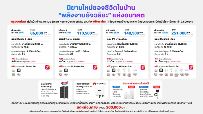 ทรูออนไลน์พลิกโฉมตลาด Solar Smart Home เหนือชั้น จับมือ Altervim ผสานโซลาร์บ้าน คู่ AI Smart Set บริหารพลังงานอัจฉริยะครบวงจร ยกระดับมาตรฐานใหม่ของบ้านยุคดิจิทัล ขานรับนโยบายรัฐ ลดหย่อนภาษีสูงสุด 200,000 บาท พร้อมโปรพิเศษรับฤดูร้อน