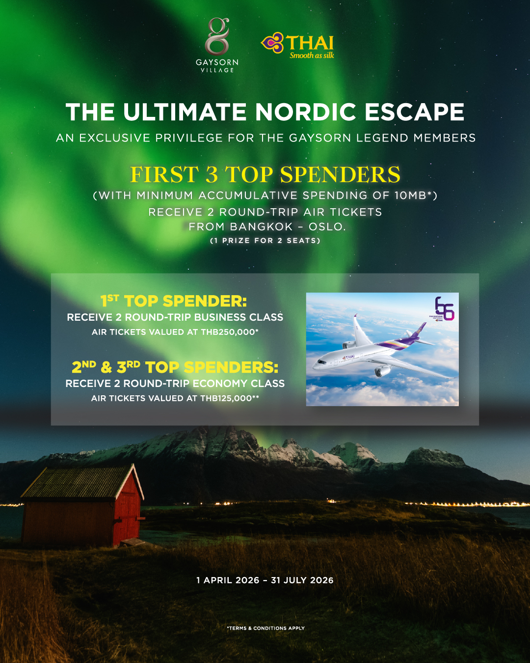 “นอกจากนี้ เกษรวิลเลจยังได้ร่วมกับ บริษัท การบินไทย จำกัด (มหาชน) โดยทีมนอร์ดิก เส้นทางบินตรงกรุงเทพฯ-ออสโล ภายใต้แนวคิด “ออสโลทริปถัดไป…เลือกการบินไทยเท่านั้น” เพื่อยกระดับประสบการณ์สุดเอ็กซ์คลูซีฟสำหรับลูกค้า Top Spender 3 ท่านแรก ผู้มียอดใช้จ่ายสะสมสูงสุดภายในเกษรวิลเลจ ระหว่างวันที่ 1 เมษายน 2569 – 31 กรกฎาคม 2569 รับสิทธิ์ตั๋วโดยสารชั้นธุรกิจเส้นทาง กรุงเทพฯ – ออสโล